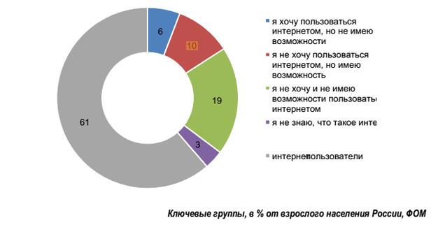 Исследование показало, что половина населения России (70,7 млн человек в месяц.) являются активными пользователями Интернета. Также по данным ФОМ, аудитория посетителей Сети составляет: